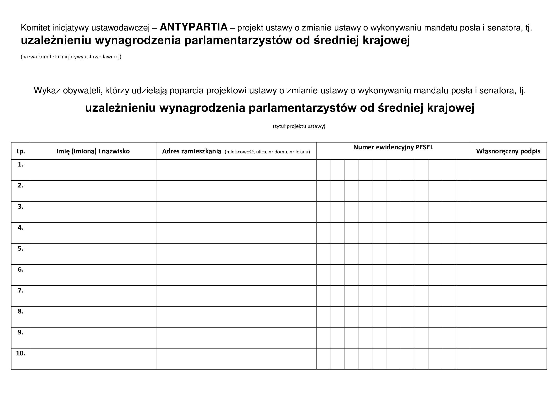 Kliknij tutaj, by pobrać listę do zbierania podpisów osób popierających projekt ustawy o dwukrotnym obniżeniu wynagrodzenia posłów i senatorów i przekaż ją nam – tel 601 255 849 – link do listy tutaj: